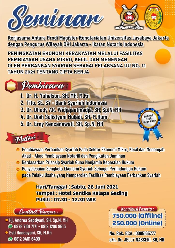 Program Studi Magister Kenotariatan Bekerja sama dengan Ikatan Notaris Indonesia, Menyelenggarakan SEMINAR NASIONAL dengan Tema : “Peningkatan Ekonomi Kerakyatan Melalui Fasilitas Pembiayaan Usaha Mikro, Kecil dan Menengah Oleh Perbankan Syariah Sebagai Pelaksana UU No,11 Tahun 2021 Tentang Cipta Kerja.”
