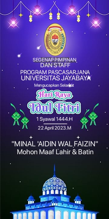 Segenap pimpinan dan staff program Pascasarjana Universitas Jayabaya mengucapkan Taqobalallahu minna wa minkum. Minal aidzin wal faidzin, Selamat hari raya Idul Fitri 1444 H, mohon maaf lahir dan batin.